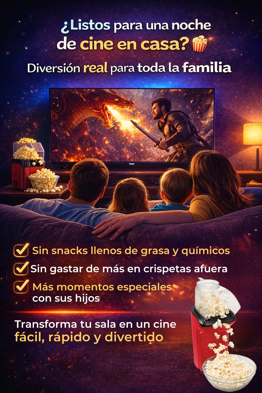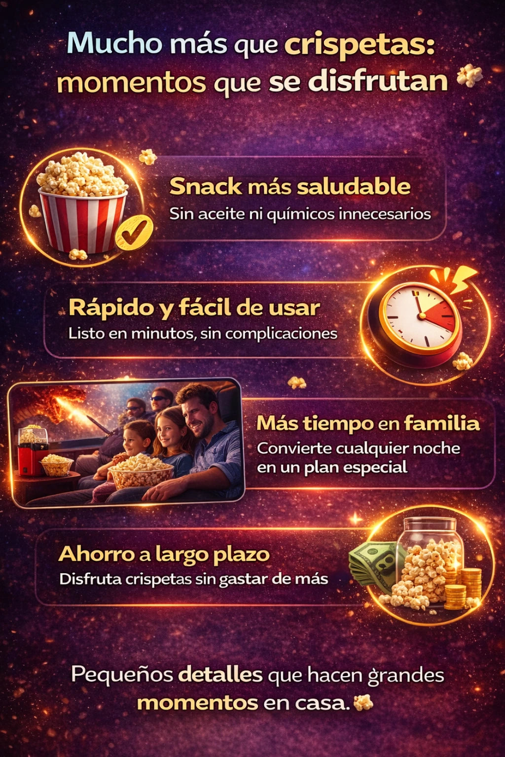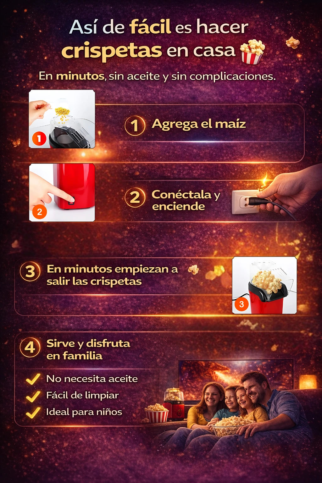 - Preparación rápida: palomitas listas en solo 3 minutos.