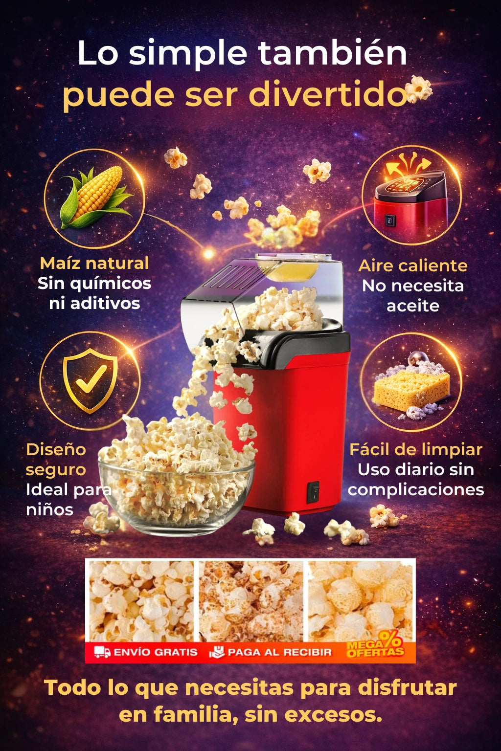 - Tecnología de aire caliente para hacer palomitas sin aceite.