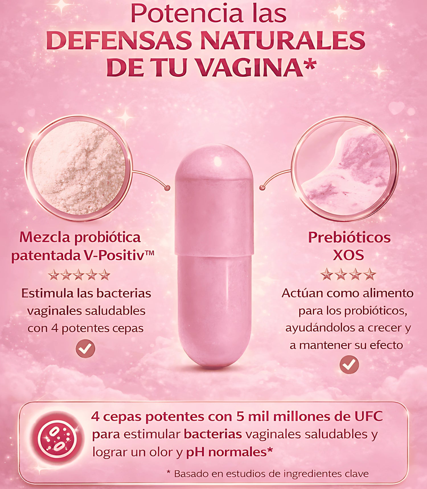 Este producto está diseñado como apoyo al bienestar íntimo femenino, ayudando a mantener el equilibrio natural de la flora vaginal y una sensación de comodidad diaria.